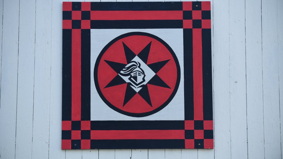 Painted by LeRoyan Donna Greene to commemorate the school spirit of LeRoy's Knights. Owner, Bill Kettle asked for a Knights Helmet to be added to the center as a symbol to celebrate his and his two sons’ graduation from LeRoy Central School.